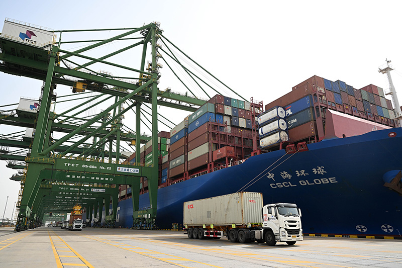 4月11日,卡车在天津港太平洋国际集装箱码头运输集装箱。