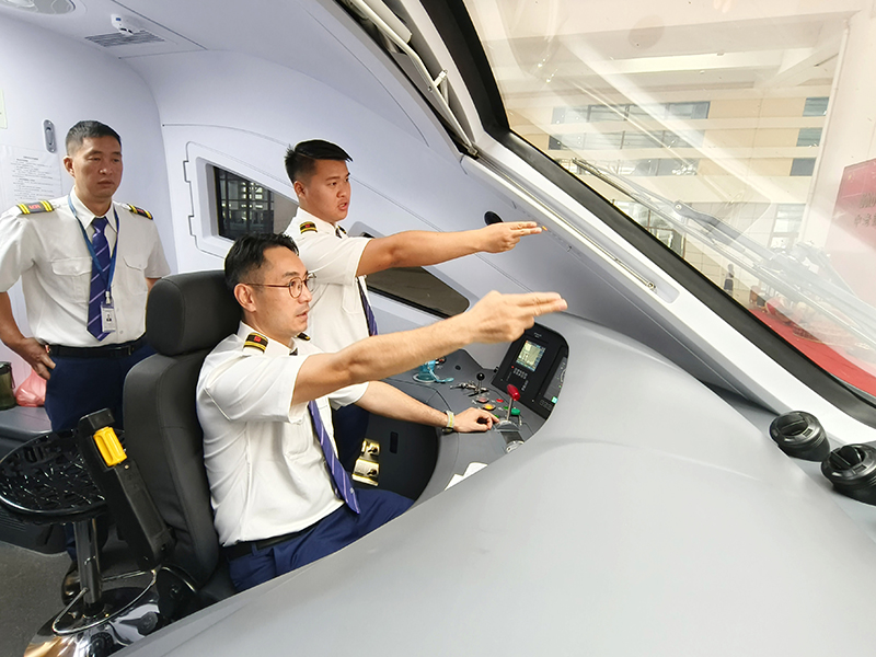 4月13日,在中老铁路老挝万象站,中老双方司机在首列万象至昆明的中老铁路国际旅客列车上为发车做准备。