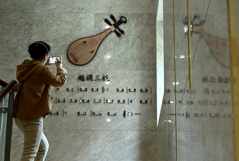 4月13日,市民在河北省石家庄丝弦艺术陈列馆参观拍照。
