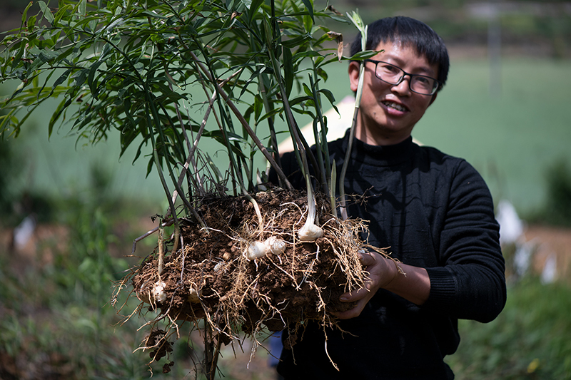 4月15日,村民在贵州省开阳县南龙乡中桥村中药材种植基地展示采收的黄精。