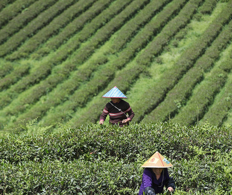 4月15日,贵州省开阳县南龙乡东官村一生态茶园,茶农在采摘春茶。