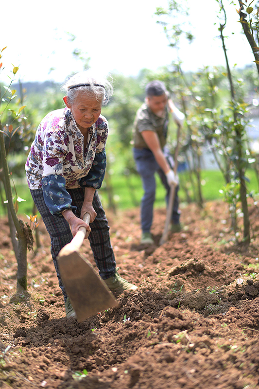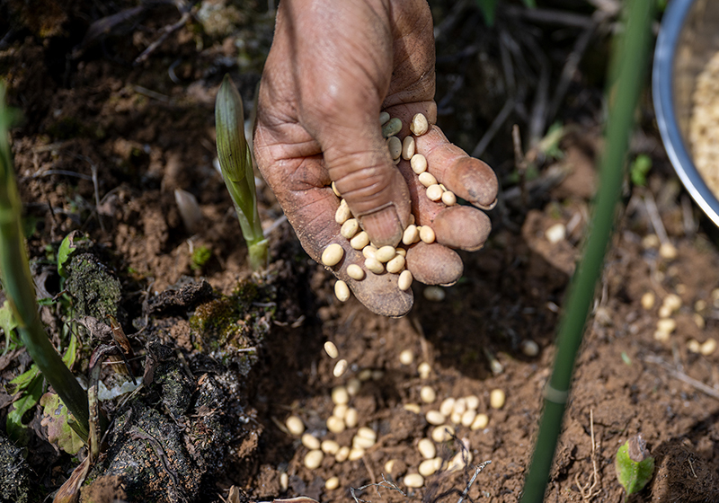 4月15日,村民在贵州省开阳县南龙乡中桥村中药材种植基地套种黄豆。