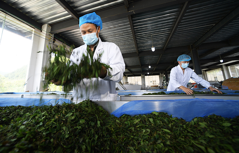 4月15日,工作人员在贵州省开阳县南龙乡田坎村一制茶厂制茶。