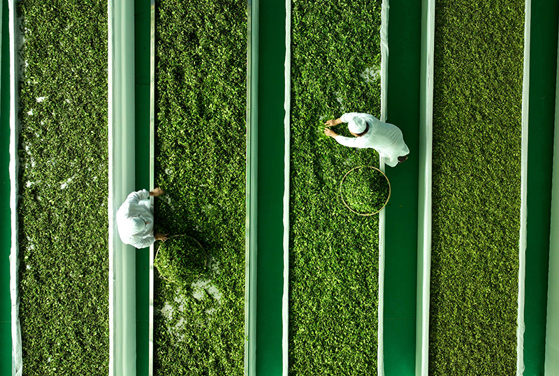 4月15日,在贵州省开阳县南龙乡翁朵村一茶叶加工厂,工人在摊晾茶青(无人机照片)。