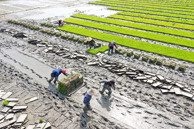 4月16日,在浙江省乐清市城东街道的一片秧田里,农民在搬运秧苗(无人机照片)。