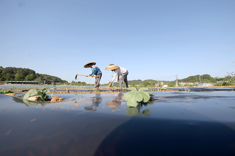 4月16日,在贵州省铜仁市玉屏侗族自治县新店镇沙水坪村,村民在西瓜地里盖膜。