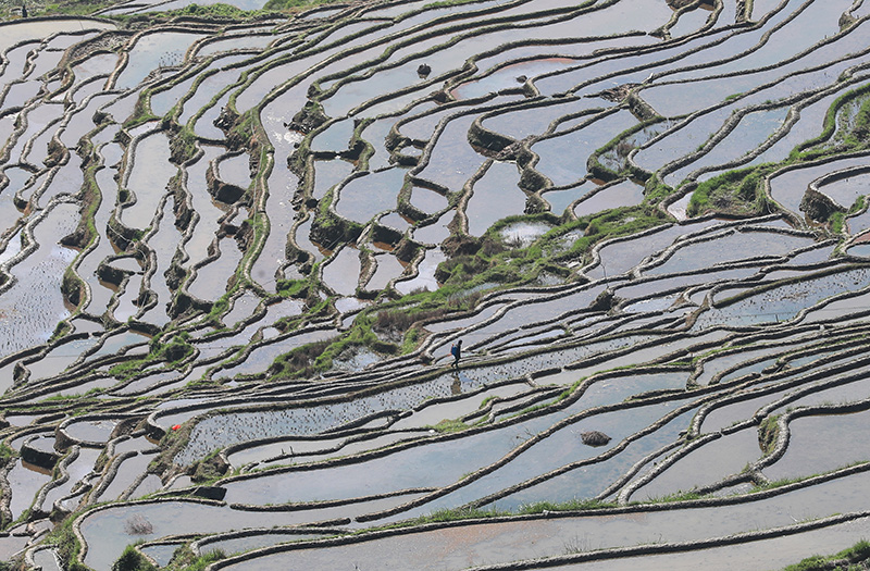 4月16日,在贵州省黔东南苗族侗族自治州从江县加榜乡党扭村,村民从梯田上走过。