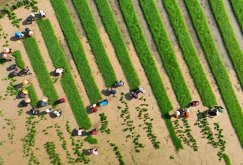 4月16日,在湖南省衡阳市祁东县金桥镇,村民在扯秧(无人机照片)。