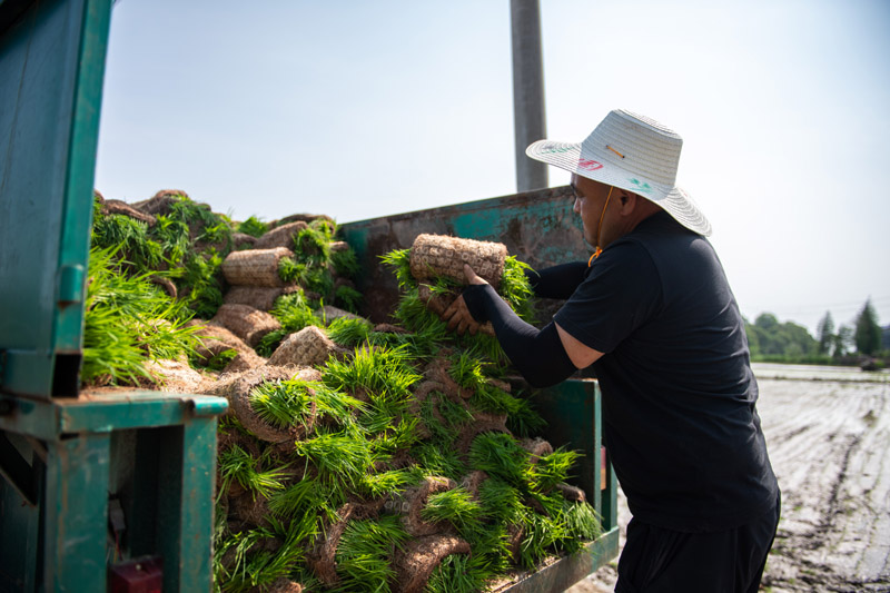 4月17日,在长沙市望城区乌山街道黄花岭村,村民在转移拖拉机上的秧苗。