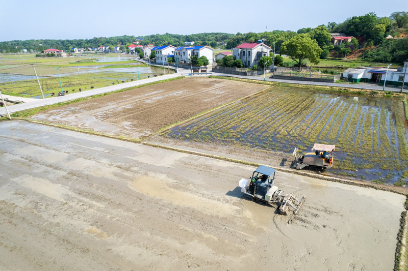 4月17日,在长沙市望城区乌山街道黄花岭村,村民驾驶插秧机进行水稻插秧作业(无人机照片)。