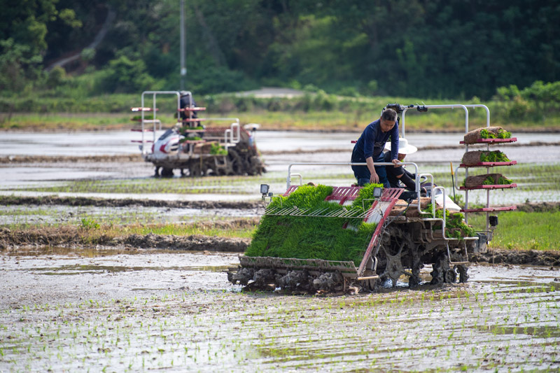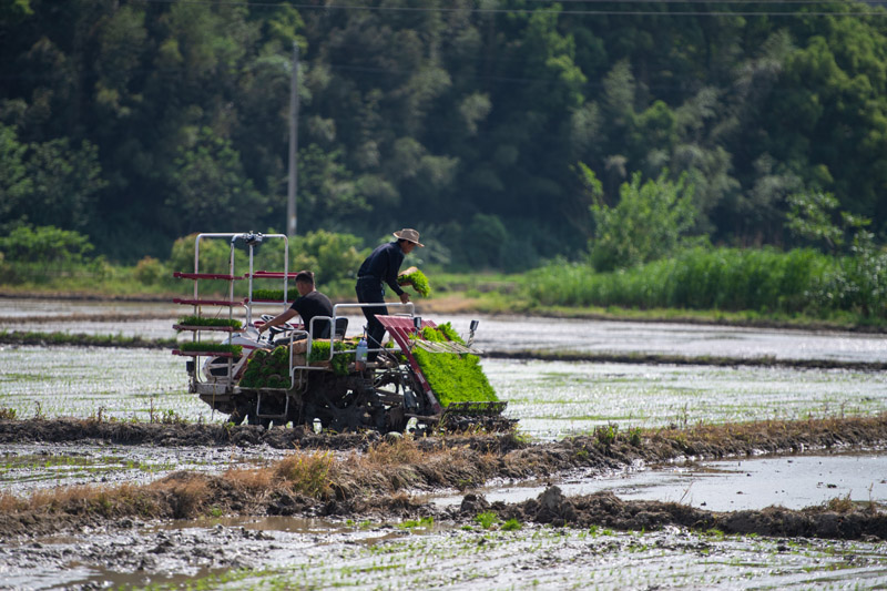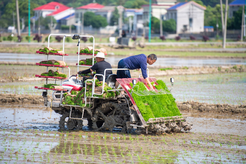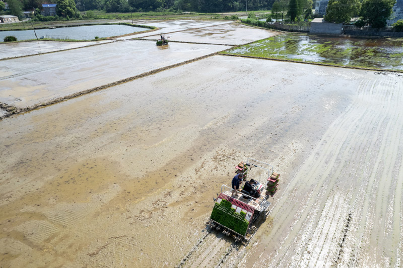 4月17日,在长沙市望城区乌山街道黄花岭村,村民驾驶插秧机进行水稻插秧作业。