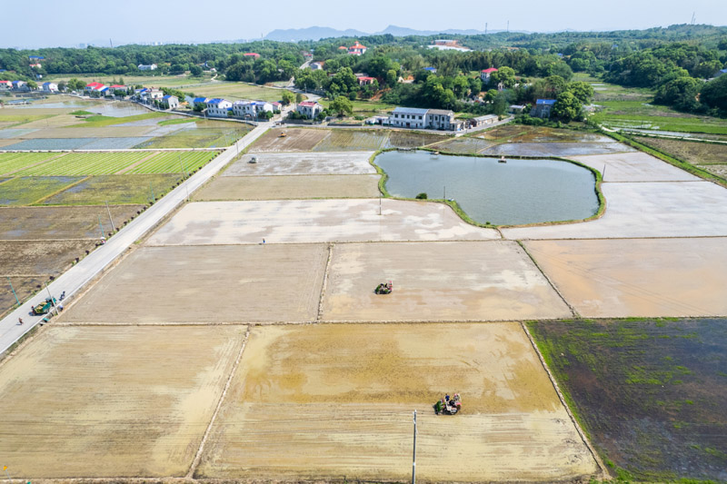 4月17日,在长沙市望城区乌山街道黄花岭村,村民驾驶农机进行翻田作业(无人机照片)。