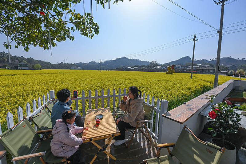 2023年3月28日,在杭州市临安区太阳镇太阳米基地旁的一家民宿餐厅,客人在院子里喝茶赏景。新华社记者 徐昱 摄