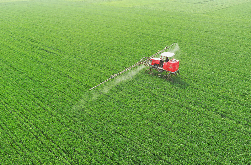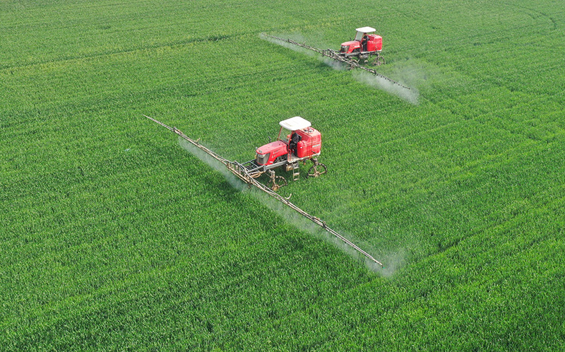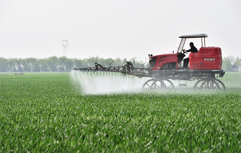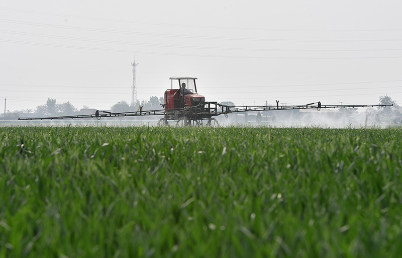 4月19日,河北省邢台市南和区河郭镇张相村农民使用农业机械在麦田喷洒农药。