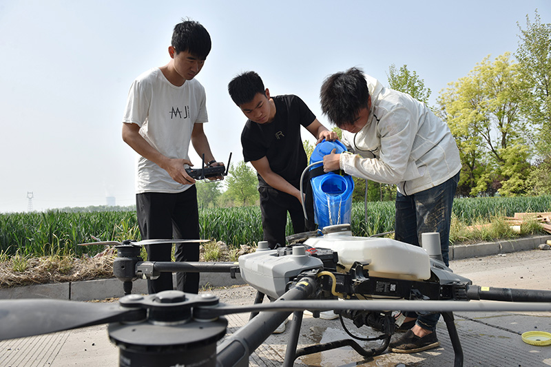 4月19日,河北省邢台市南和区河郭镇张相村农民为植保无人机添加农药。