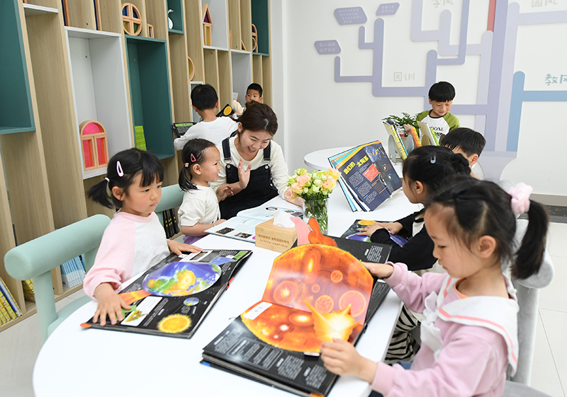 4月19日,吴兴区八里店镇中心幼儿园的老师带着孩子们在书吧阅读绘本。