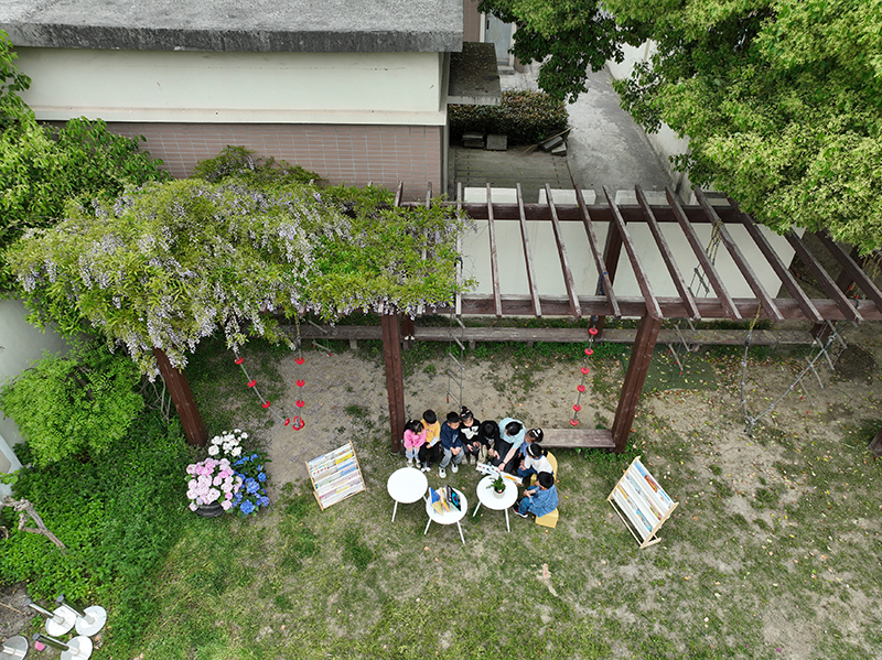 4月19日,吴兴区八里店镇中心幼儿园的老师带着孩子们在紫藤架下阅读(无人机照片)。