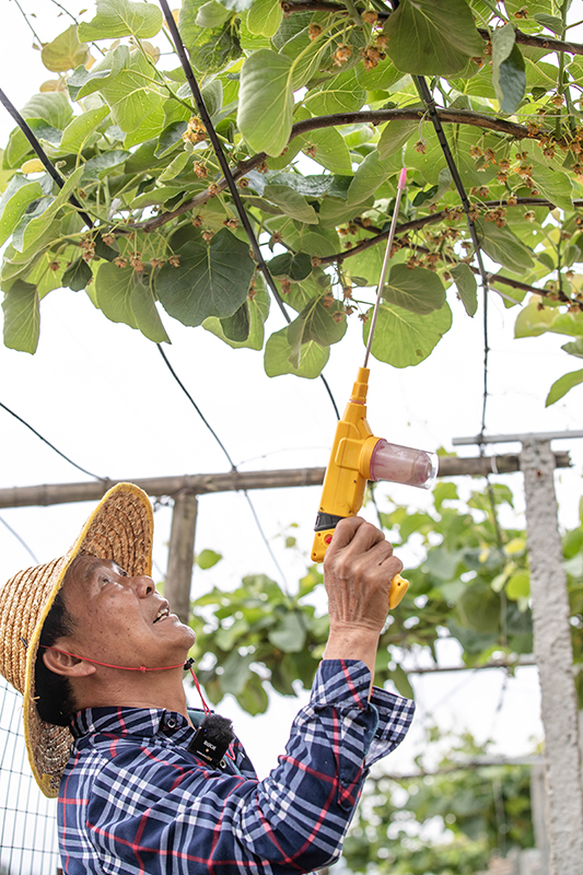 4月18日,在大湖乡东姚村湖东果蔬农民专业合作社种植基地,村民在给猕猴桃进行人工授粉。