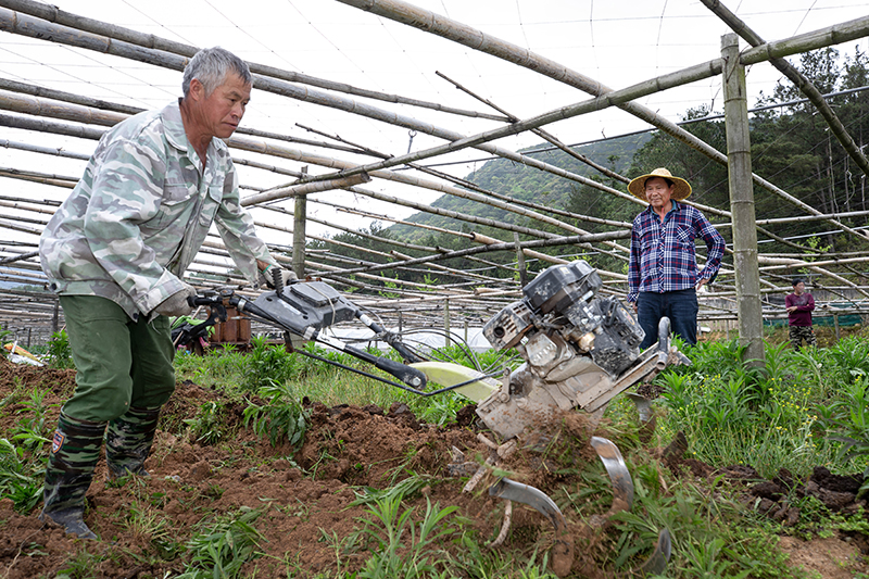 4月18日,在大湖乡东姚村湖东果蔬农民专业合作社种植基地,村民在翻土准备播种西瓜。