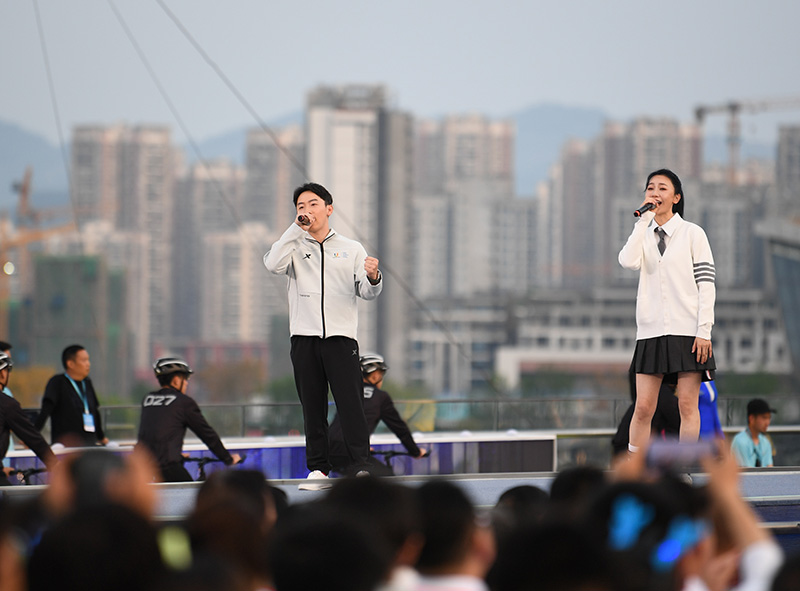 4月19日,在成都大运会倒计时100天启动仪式上,体操世界冠军邹凯(左)演唱歌曲《欢迎来成都》。