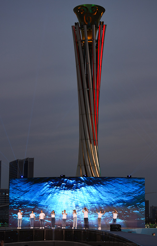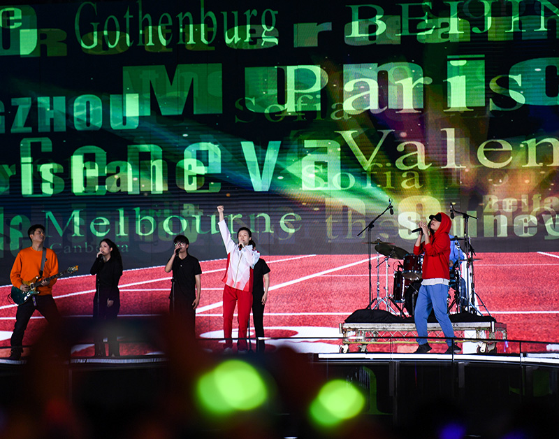 4月19日,在成都大运会倒计时100天启动仪式上,跳水世界冠军施廷懋(左四)和乐队一起演唱歌曲《梦想的冠军》。