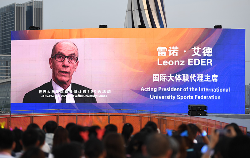 4月19日,在成都大运会倒计时100天启动仪式上,国际大体联代理主席雷诺·艾德视频致辞。