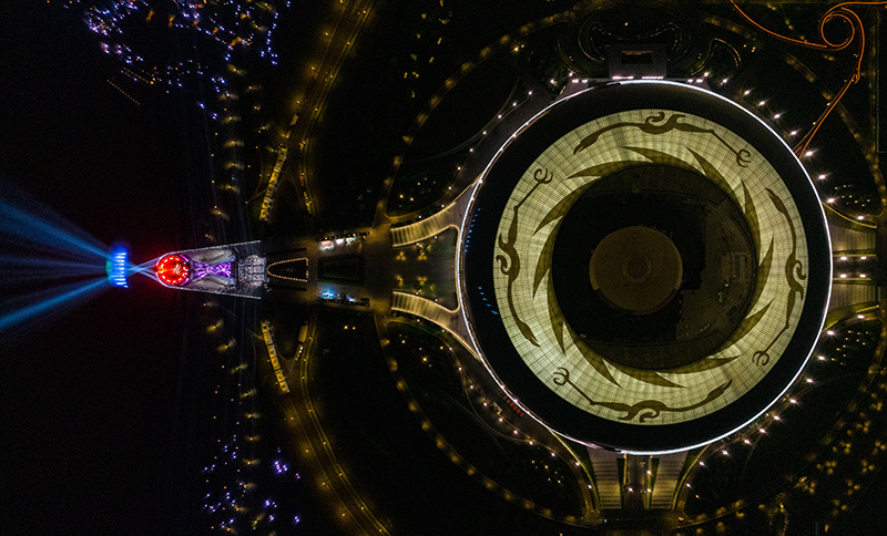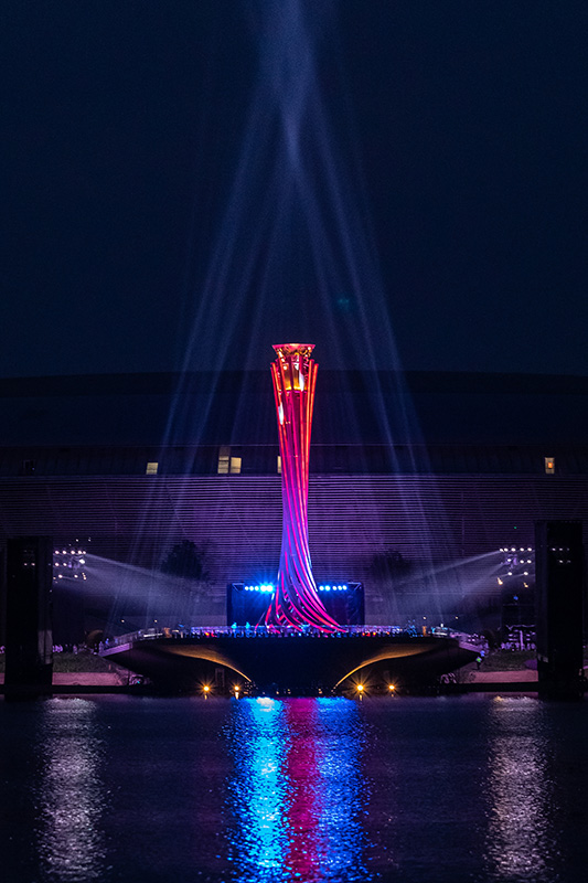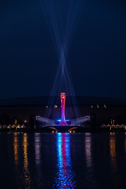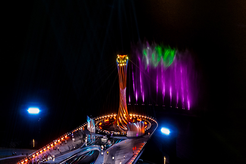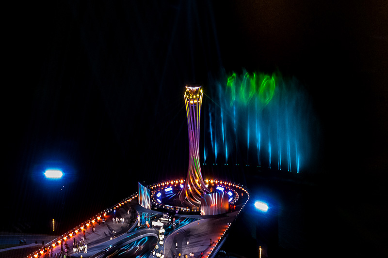 这是4月19日拍摄的第31届世界大学生夏季运动会主火炬以及映在水幕上的“100”字样(无人机照片)。