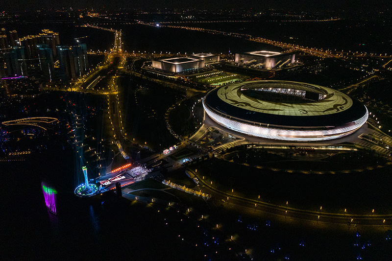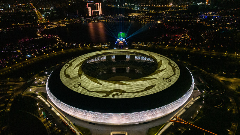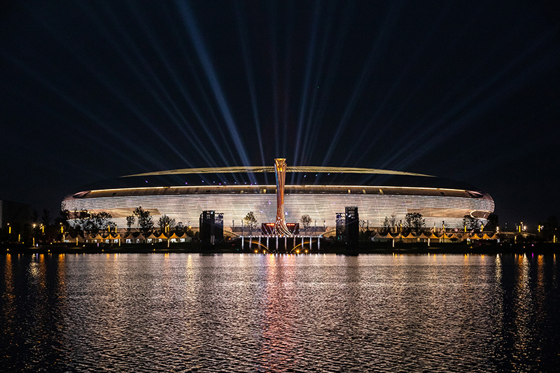 这是4月19日拍摄的第31届世界大学生夏季运动会开幕式主体育场及主火炬。