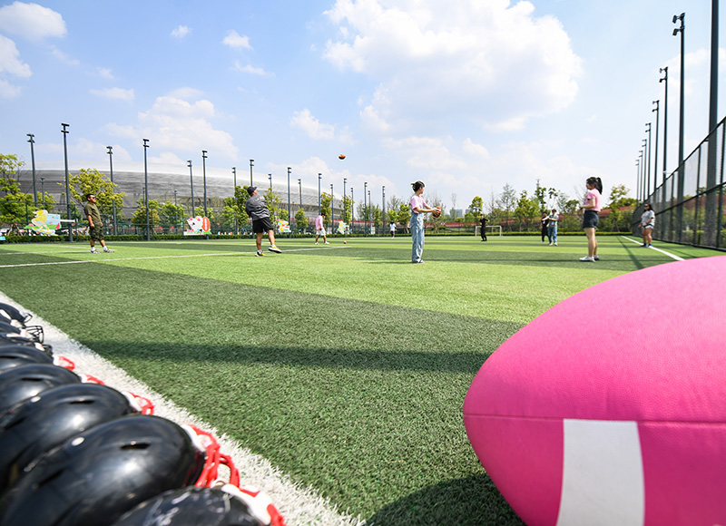 4月19日,在成都东安湖体育公园,体育爱好者在 “潮流运动会”上体验橄榄球。