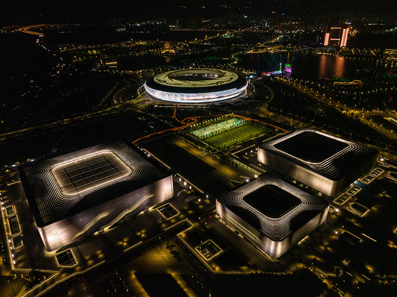 这是4月19日拍摄的东安湖体育公园内的第31届世界大学生夏季运动会开幕式主体育场(后)以及三个运动场馆(前)(无人机照片)。