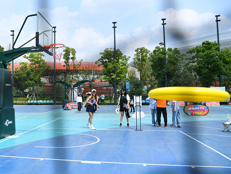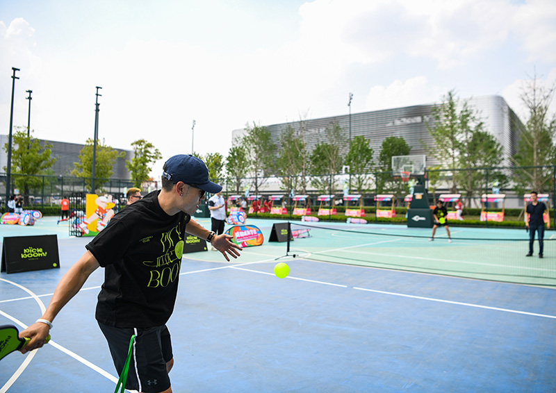 4月19日,在成都东安湖体育公园,体育爱好者在 “潮流运动会”上打匹克球。
