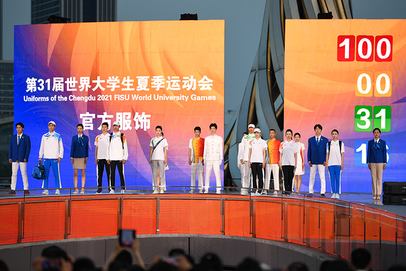 4月19日,在成都大运会倒计时100天启动仪式上,模特展示成都大运会官方服饰。