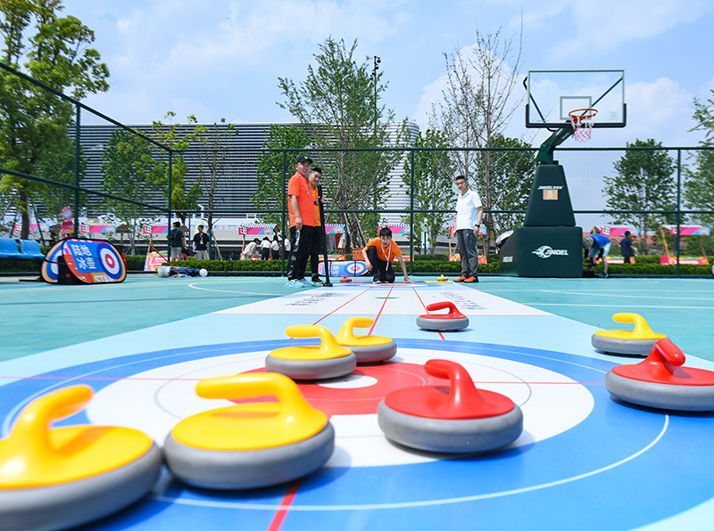 4月19日,在成都东安湖体育公园,体育爱好者在 “潮流运动会”上体验陆地冰壶。
