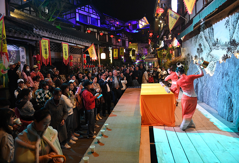 3月20日,游客在四川省阆中市南津关古镇观看《蜀道盛世》移动实景演出。新华社记者 刘坤 摄