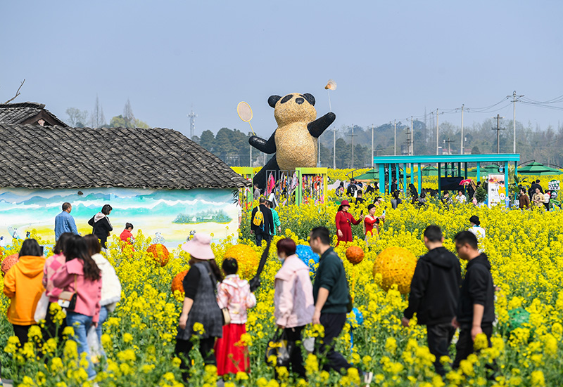 3月5日,在四川省崇州市道明镇,游客在油菜花田中观光。新华社记者 王曦 摄