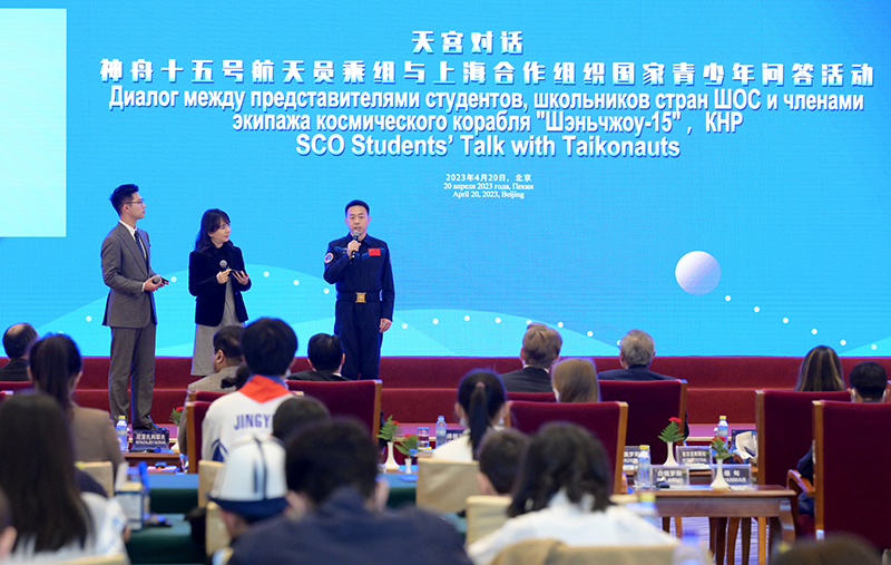 4月20日,神舟十五号航天员通过视频屏幕回答上海合作组织国家青少年的提问。