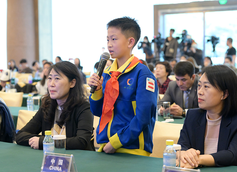 4月20日,参加活动的一名小男孩在位于北京的主会场内向航天员提问。