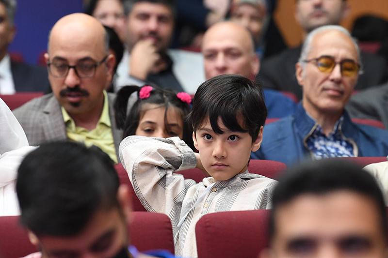 这是4月20日在伊朗首都德黑兰青少年智育中心礼堂拍摄的天宫对话——神舟十五号航天员乘组与上海合作组织国家青少年问答活动的伊朗会场现场。