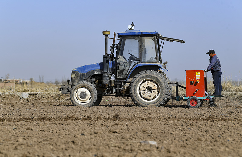2023年3月3日,在宁夏银川市贺兰县立岗镇银星村,一台装有北斗导航系统的无人驾驶播种机进行播种作业。新华社记者 冯开华 摄