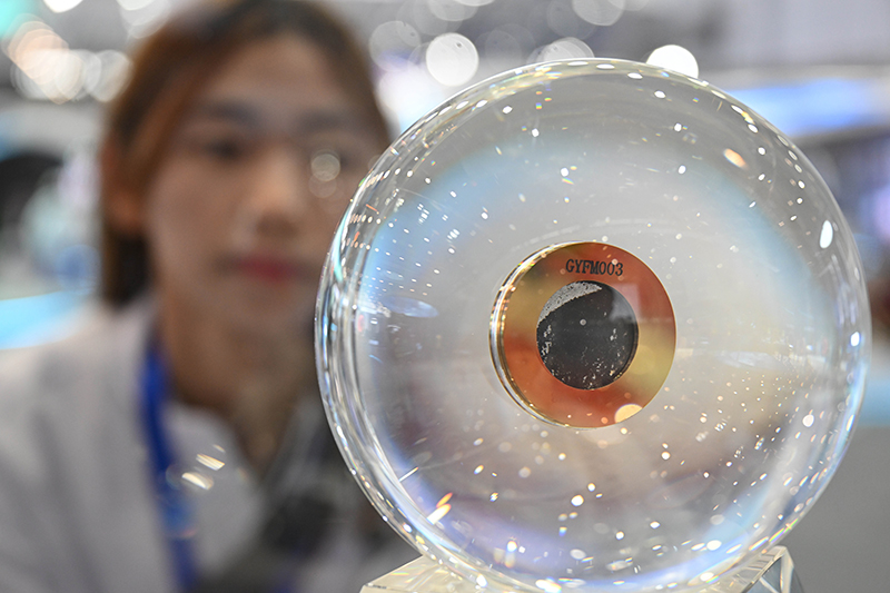 4月24日,观众在2023年“中国航天日”科普展览上观察月壤。