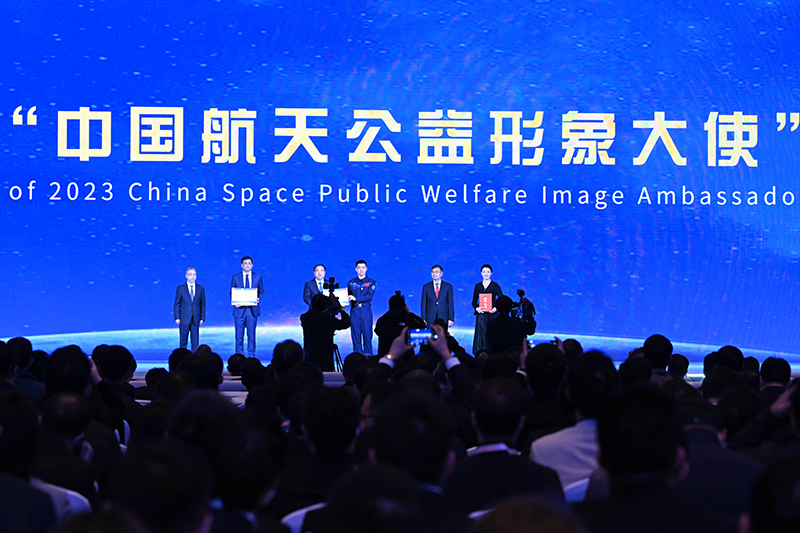4月24日,航天员陈冬(右三)、中国科学院院士王赤(左二)、黄梅戏表演艺术家韩再芬(右一)被授予2023年“中国航天公益形象大使”称号。