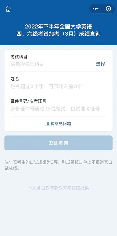 2022年下半年全国大学英语四、六级考试加考(3月)成绩查询服务