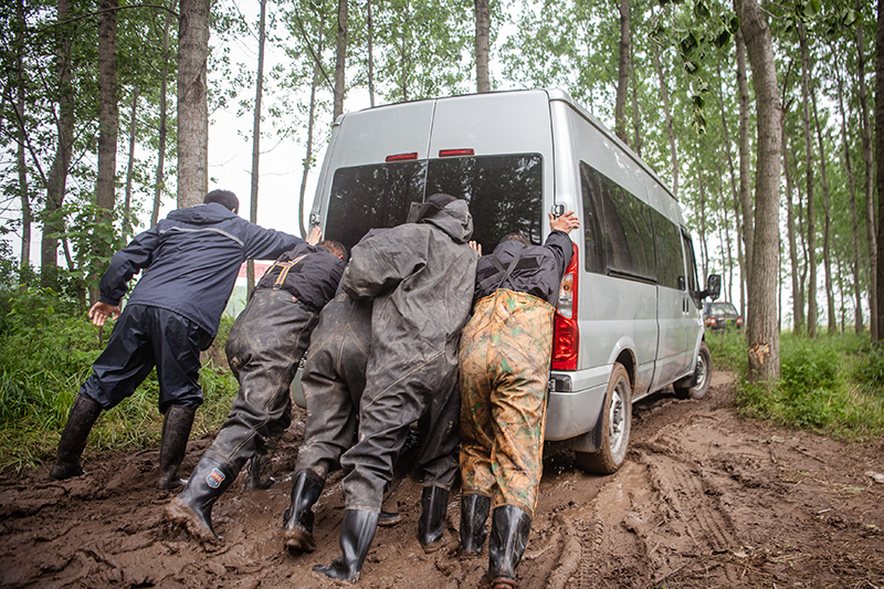 4月25日,工作人员合力推动江豚运输车辆驶过泥泞路面。