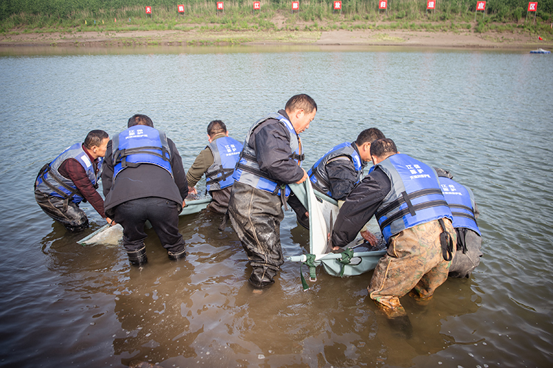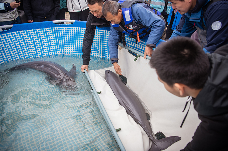 4月25日,工作人员把江豚从人工蓄水池中转运至江边。