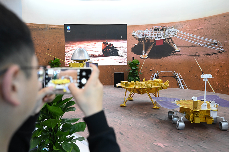 4月24日,观众在科普展区拍摄火星探测器模型。