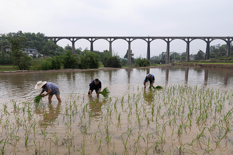 4月25日,在泸县奇峰镇宝丰村,村民在宝藏渡槽附近的水田里插秧。