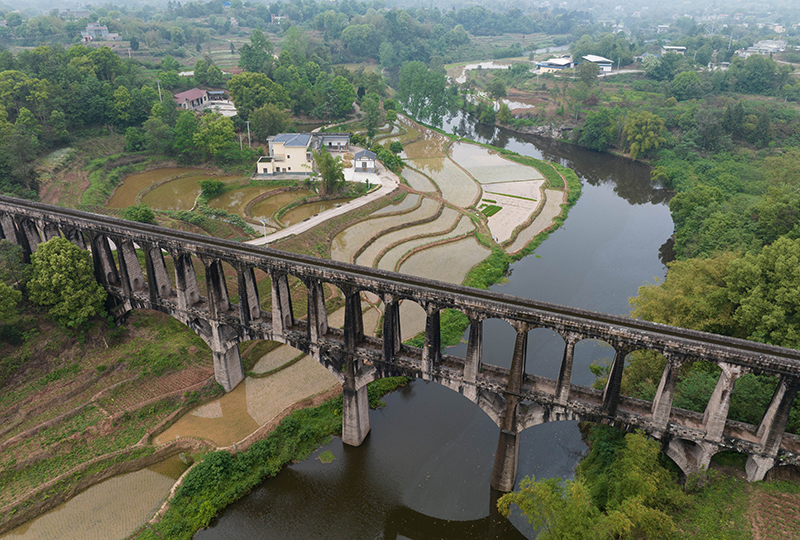 4月25日在泸县奇峰镇拍摄的胜利渡槽(无人机照片)。跨越龙溪河的胜利渡槽分上下两层,上层通水,下层为人行通道,非常独特。
