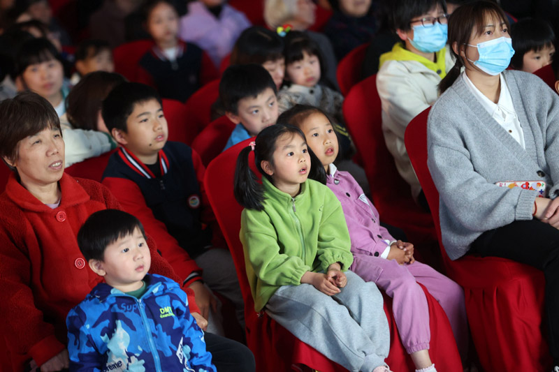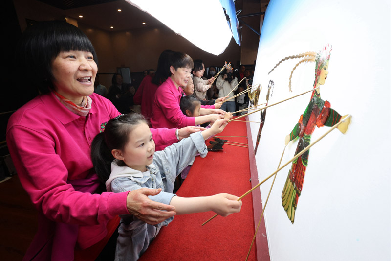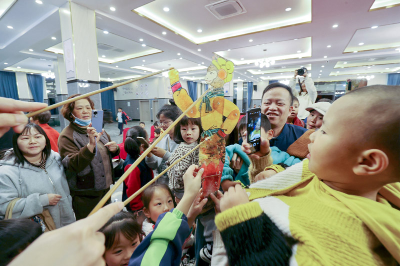 4月24日晚,在德清县禹越镇东港村文化礼堂,孩子们在体验皮影戏表演。