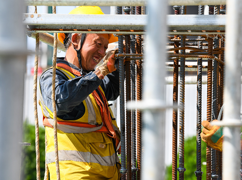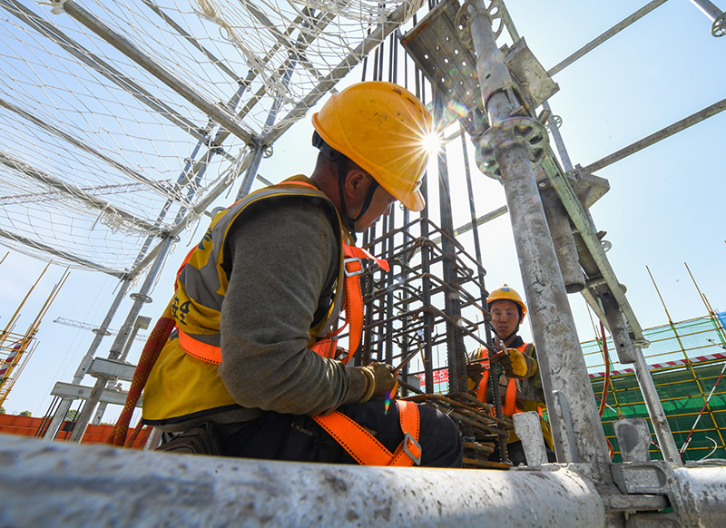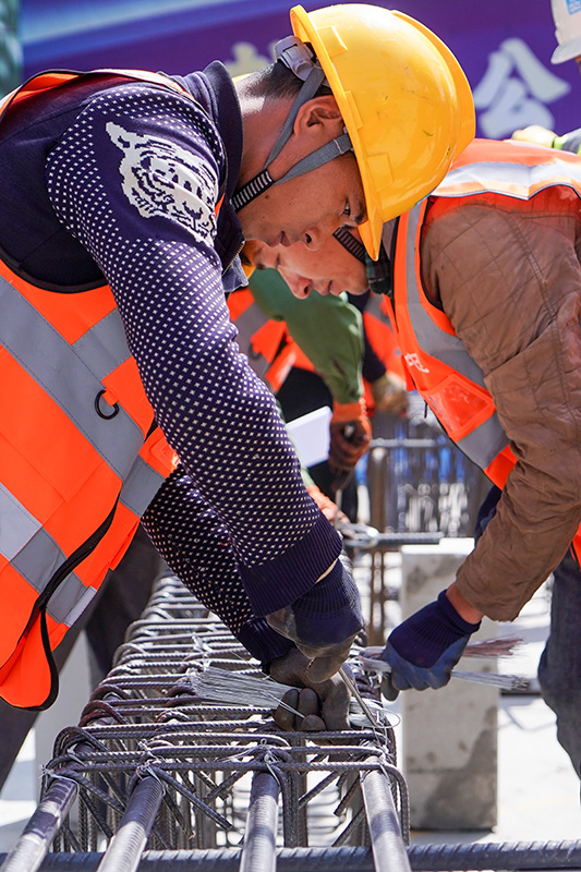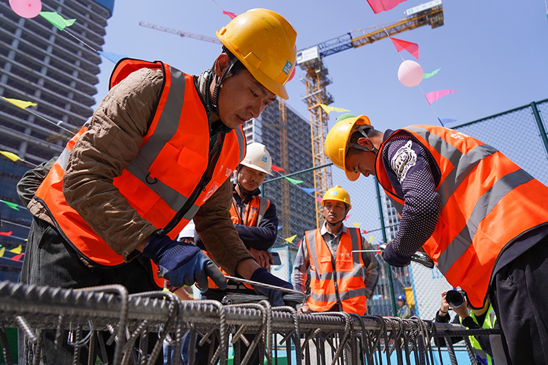 4月27日,在江苏南京华贸项目施工现场,建设者代表在中建三局浙江公司组织的“技能大比武”活动中参加钢筋绑扎比赛。