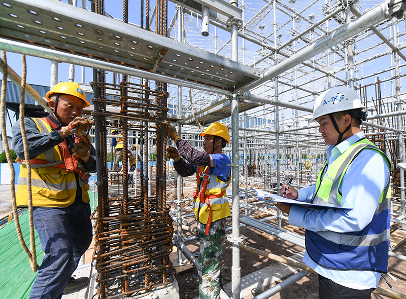 4月27日,在中建安装集团有限公司位于四川遂宁市射洪市的厂房增产扩能项目建设现场,记分员(右)在柱钢筋绑扎比赛项目中打分。
